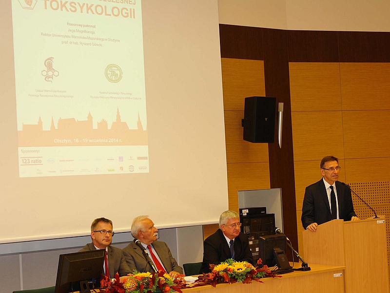 W dniach 16-19 września 2014 roku na Wydziale Medycyny Weterynaryjnej odbyła się Konferencja szkoleniowo-naukowa Polskiego Towarzystwa Toksykologicznego pt: „Człowiek, żywność środowisko – problemy współczesnej toksykologii”. Konferencję objął Honorowym Patronatem J.M. Rektor Uniwersytetu Warmińsko-Mazurskiego w Olsztynie prof. dr hab. Ryszard Górecki. Konferencja została zorganizowana przez Oddział Warmińsko-Mazurski Polskiego Towarzystwa Toksykologicznego w Olsztynie i Katedrę Farmakologii i Toksykologii Wydziału Medycyny Weterynaryjnej Uniwersytetu Warmińsko-Mazurskiego w Olsztynie. Przewodniczącym Komitetu Organizacyjnego był dr Dariusz Barski – przewodniczący Oddziału Warmińsko-Mazurskiego PTToks. Konferencję zaszczycili swoją obecnością m.in. Prezydent Miasta Olsztyna dr Piotr Grzymowicz, Prorektor ds. Nauki UWM prof. dr hab. Jerzy J. Jaroszewski, Dziekan Wydziału Medycyny Weterynaryjnej prof. dr hab. Andrzej Koncicki, Prezes Polskiego Towarzystwa Toksykologicznego prof. dr hab. Wojciech Wąsowicz oraz Dyrektor Wojewódzkiej Stacji Sanitarno-Epidemiologicznej lek wet. Janusz Dzisko oraz Członkowie Honorowi Polskiego Towarzystwa Toksykologicznego w osobach: prof. dr hab. Marcin Kamiński (Katowice), prof. dr hab. Jerzy Krechniak (Gdańsk), prof. dr hab. Jan Krzysztof Ludwicki (Warszawa), prof. dr hab. Janina Moniuszko Jakoniuk (Białystok) oraz prof. dr hab. Andrzej Starek (Kraków).