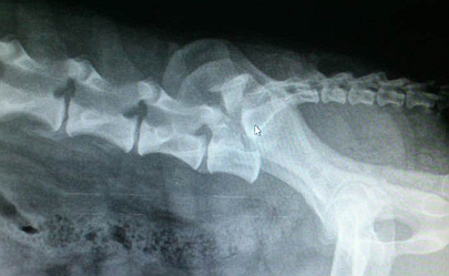 Zwichnięcie  kręgosłupa na poziomie trzonu kręgów L7 - S1 jest stosunkowo częstym następstwem wypadków drogowych u psów. Dodatkowym obrażeniem towarzyszącym zwichnięciu na opisywanym poziomie jest złamanie z przemieszczeniem trzonu kręgu L7, złamanie z przemieszczeniem wyrostka stawowego (przykład w zamieszczonych radiogramach). Leczeniem zwichnięcie kręgosłupa na poziomie L7-S1 jest osteosynteza z użyciem wkrętów ortopedycznych i gwoździa śródszpikowego. Należy pamiętać, że w każdym przypadku konieczne jest badanie neurologiczne oraz radiograficzne.